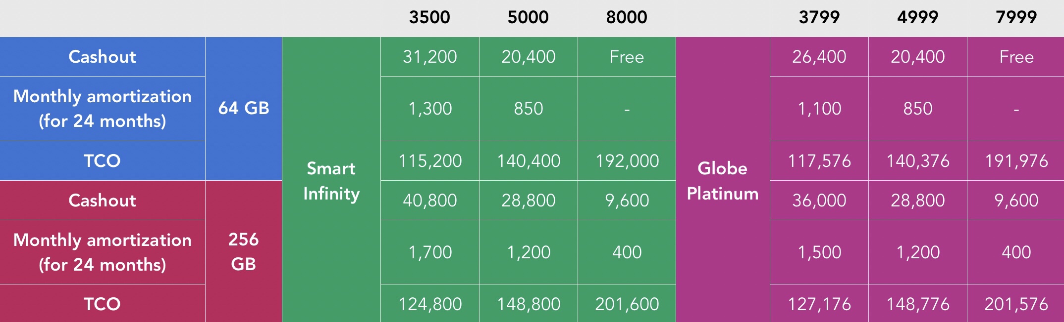 Both Globe and Smart offers the choice of paying for the device outright or opting for monthly amortization. When comparing the lowest tier plans, Globe’s cashout is cheaper, and even though the monthly subscription is ₱299 more expensive, there’s only ₱2,376 difference in the total cost of ownership (TCO) between Smart and Globe. That’s ₱99 more per month for 24 months.