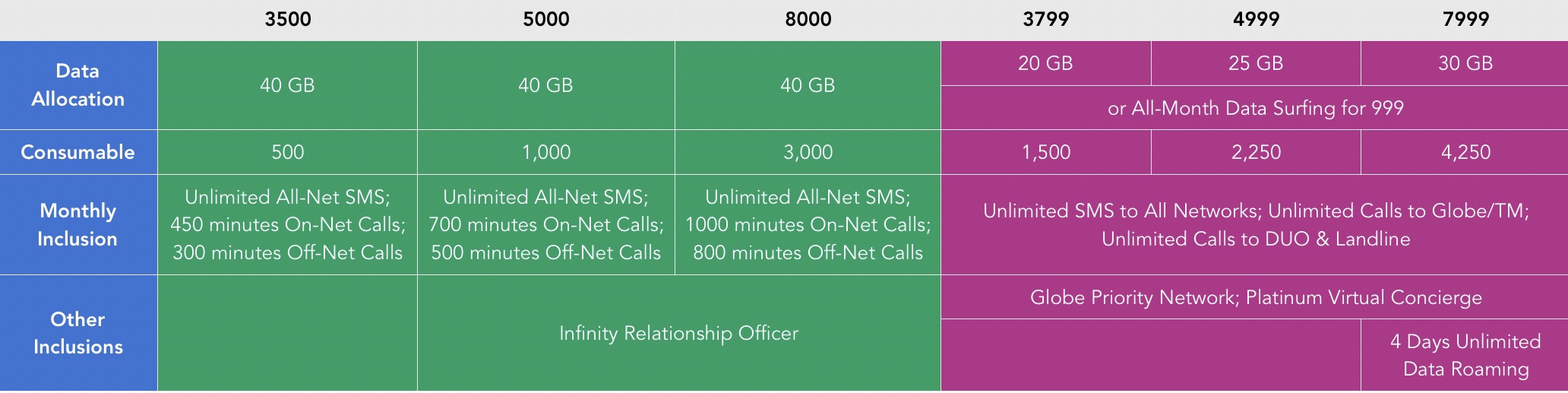 What about the features? Smart seemingly comes out ahead with its 40 GB monthly data allocation across all three tiers while Globe only offers up to 30 GB. However, when under Platinum plan, you can opt to subscribe to All-Month Data Surfing for only ₱999 per month which is deductible from your monthly consumable. Both carriers offer unlimited SMS to all networks. In terms of calls, Globe really wants to keep it in the family so to speak, only allowing unlimited calls within the Globe/TM network. In the meantime, Smart is more forgiving, allocating minutes for calls within and without their network.